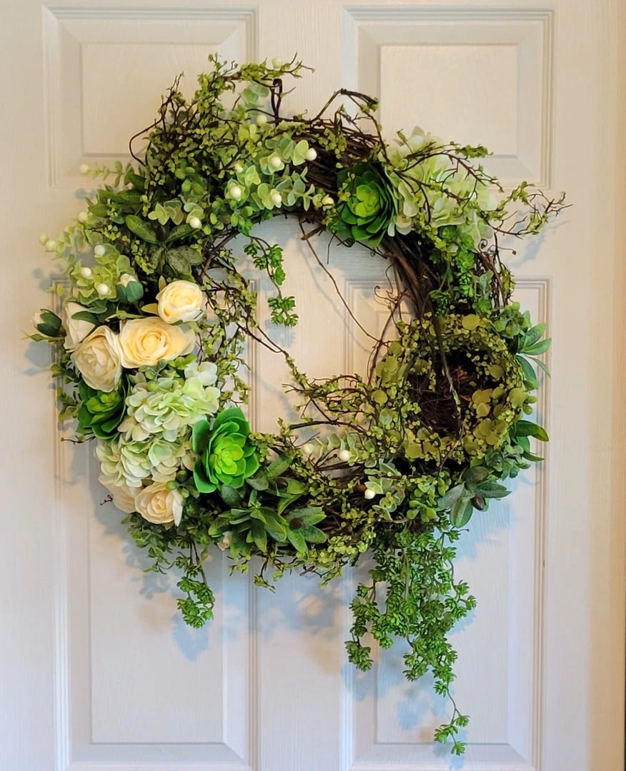 Fresh as a spring morning, this green and white grapevine wreath features white and cream florals with a variety of greenery, including succulents. 28″ at its longest point.