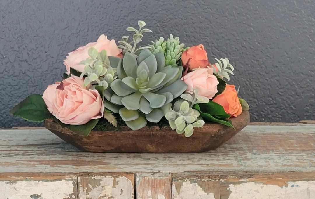 This arrangement is designed with light coral rose buds, succulents and coral cabbage roses.Â