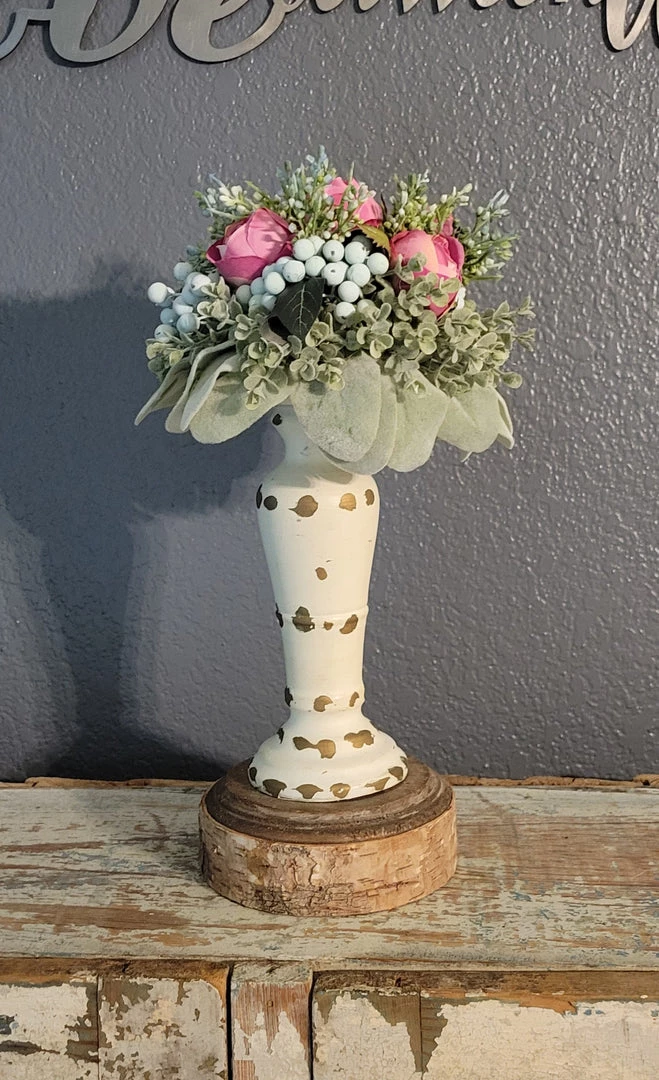This floral is designed with real touch rose buds, teal berries and lamb’s ear.