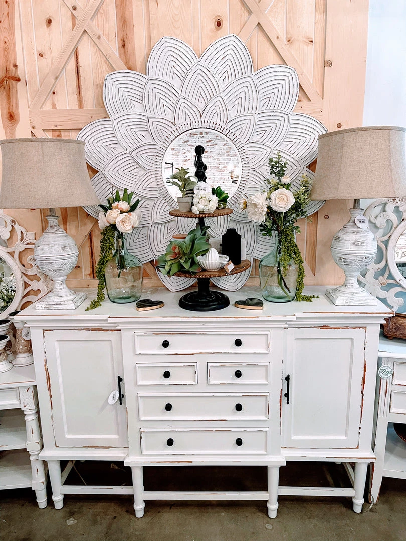 The dynamic duo: style and storage! This versatile breakfront boasts a classic style with a white distressed finish and black hardware. Imagine it in your master bedroom, living, or dining room.