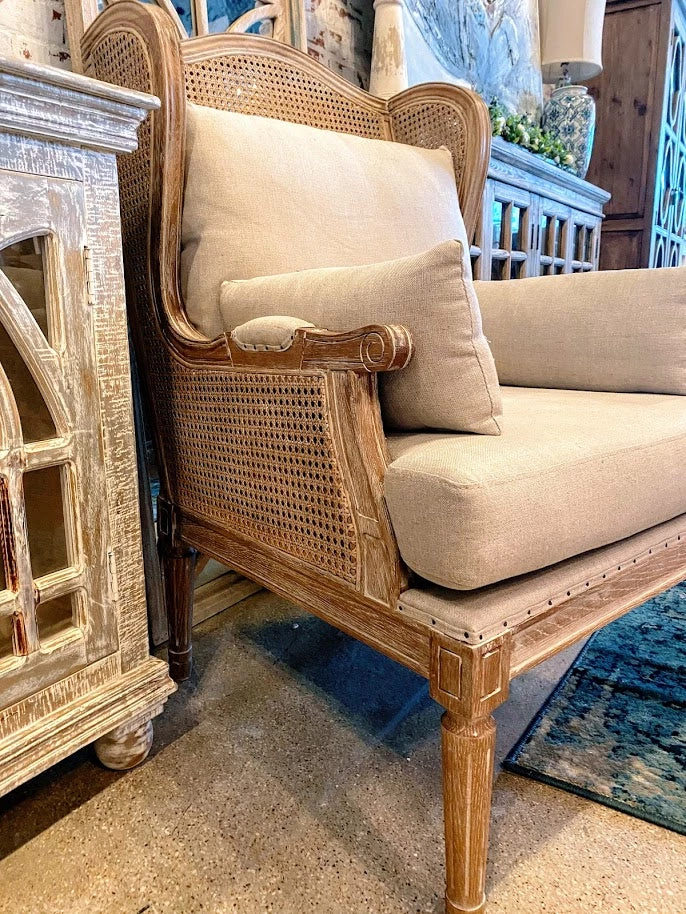 A wonderful new take on the classic wingback chair, this one with beautiful carved details, caning, and creamy linen upholstery with petite nail head trim. Its light wood and whitewash finish make it the perfect accent seating in any room. Consider a pair with one of our side tables for comfortable and eye-catching bedroom seating.