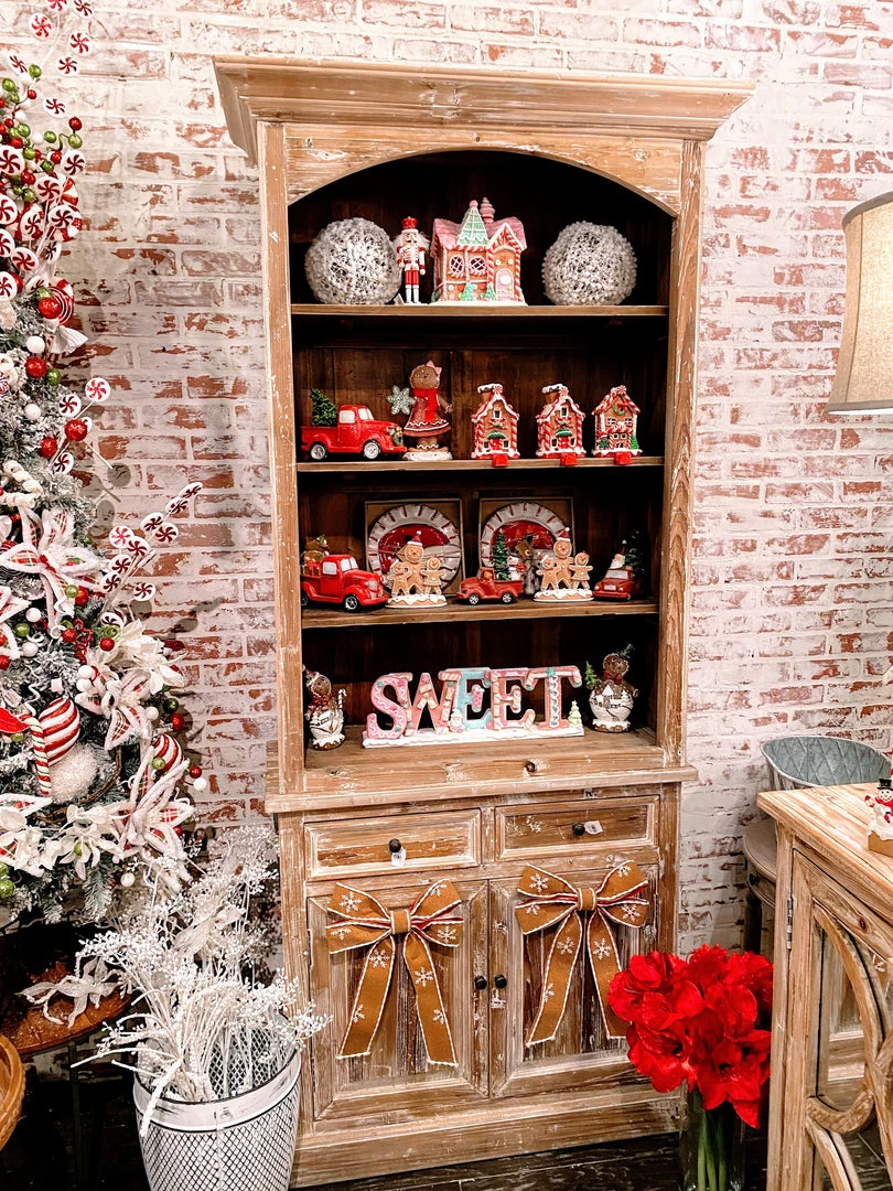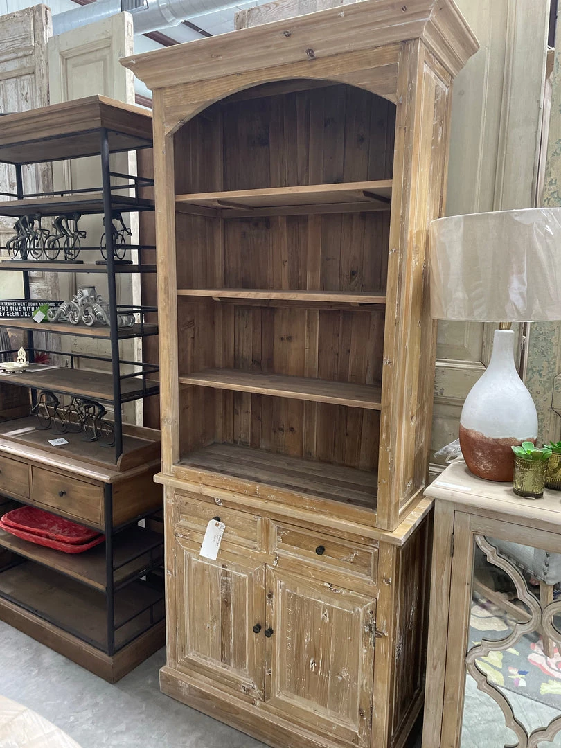 Beautifully hand-carved solid reclaimed Elm bookcase providing storage and display space! Open shelving on top and a drawer/cabinet combination on the bottom. Uniquely, beautiful piece!