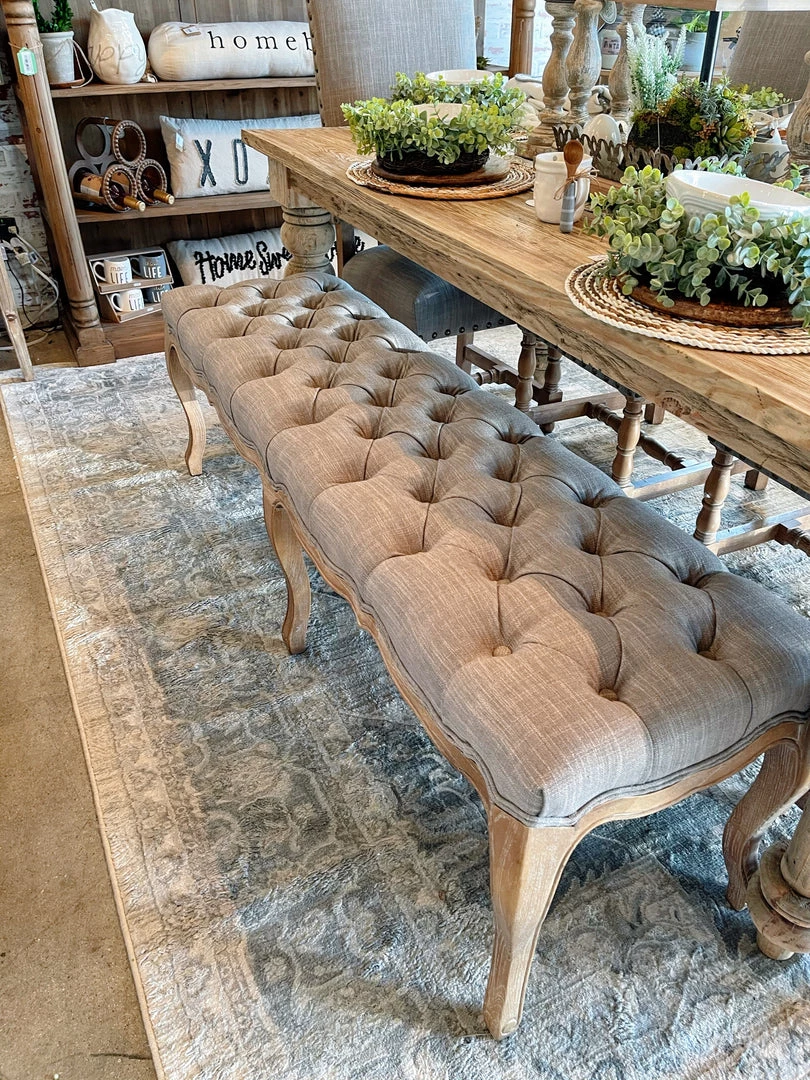 A standout! Our stylish linen upholstered bench makes the most of your dining space. Also great at the foot of the bed or as a foyer bench. Sophisticated tufting and curvy wood trim and legs in lightly whitewashed finish.