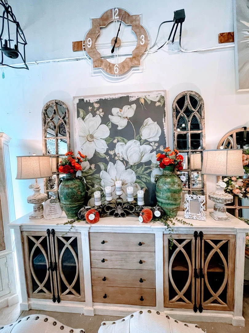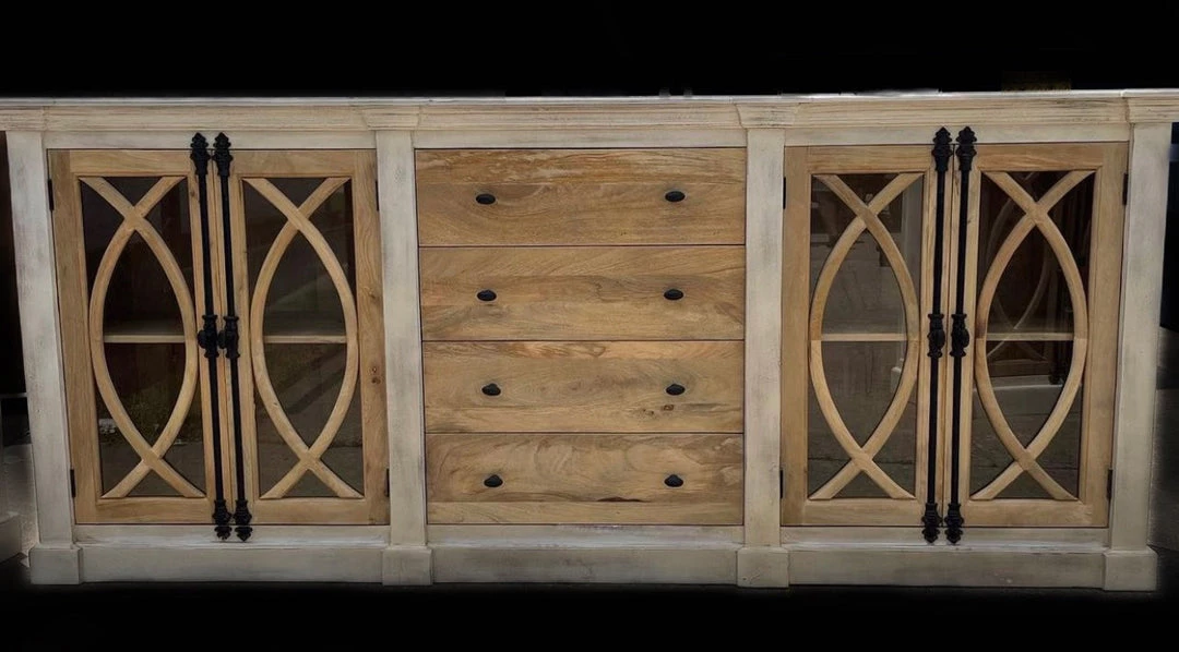 Our extra long white and wood console features antiqued white finish cabinet with stained wood doors and drawers. You’ll love the fretwork and glass doors and stunning black cremone bolt hardware. Perfect for your dining room buffet or your TV console–or an accent piece anywhere. Plenty of storage and style here!