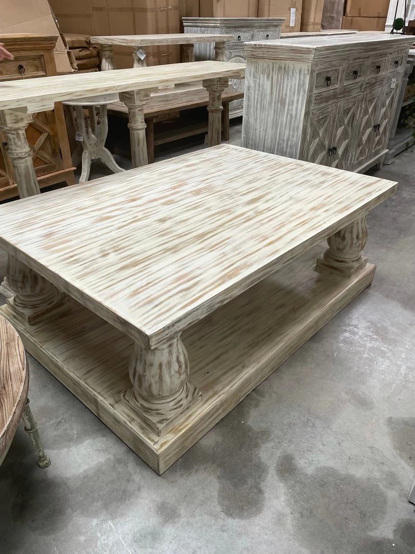You’ll love our solid mahogany wood coffee table for its great size, rustic whitewashed wood finish, and chunky turned legs! Perfect for the great room or media room!