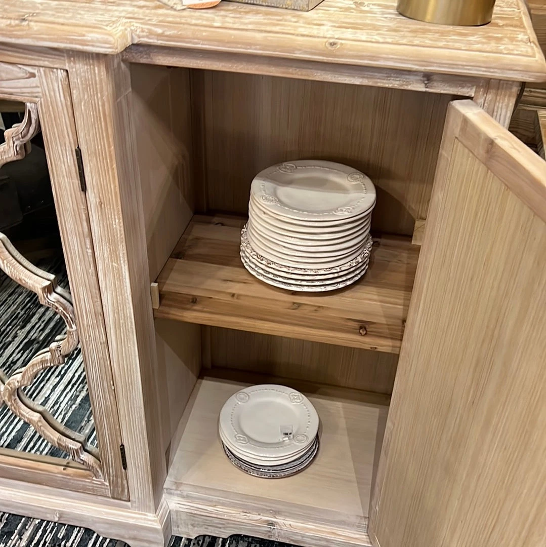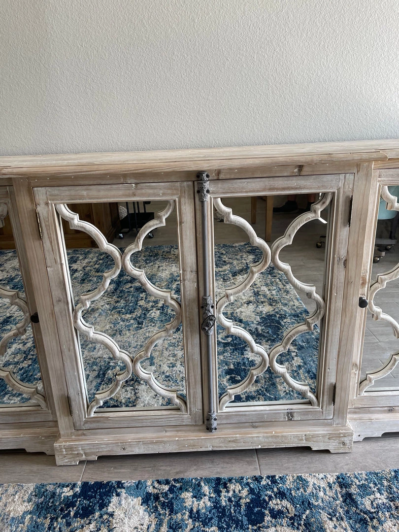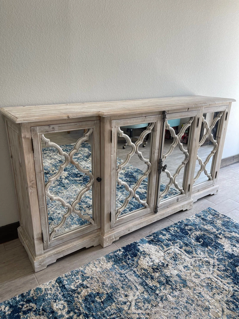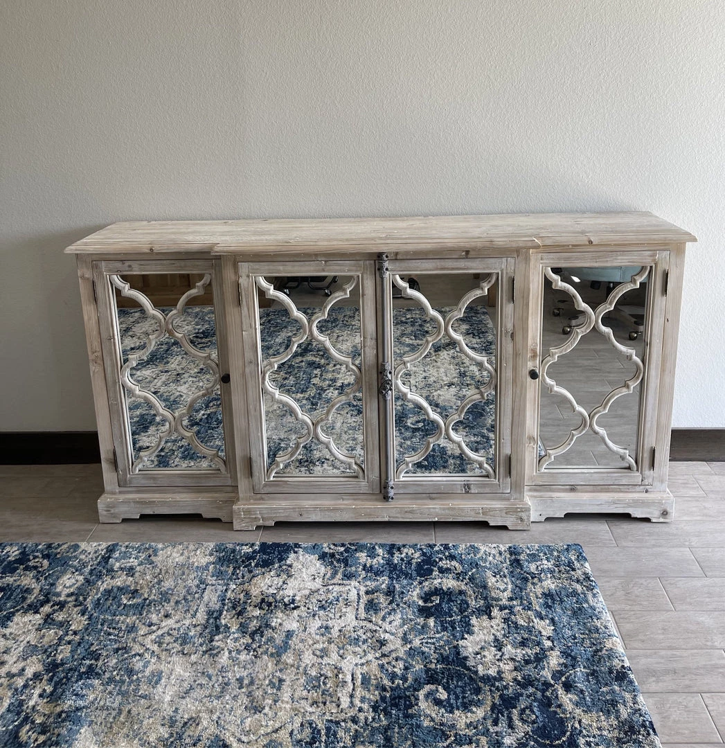 Elm breakfront console in a white wash finish, with stunning fretwork detailing on mirrored doors. Its generous proportions make it a stunning addition to your foyer. Also perfect as your dining buffet. Or–as the most stylish tv console on the planet!