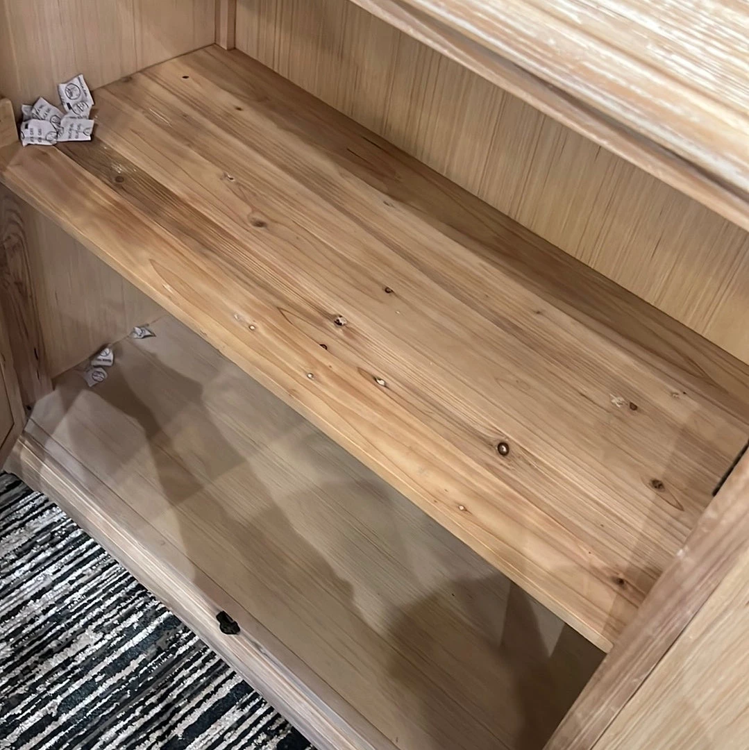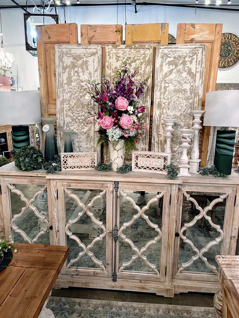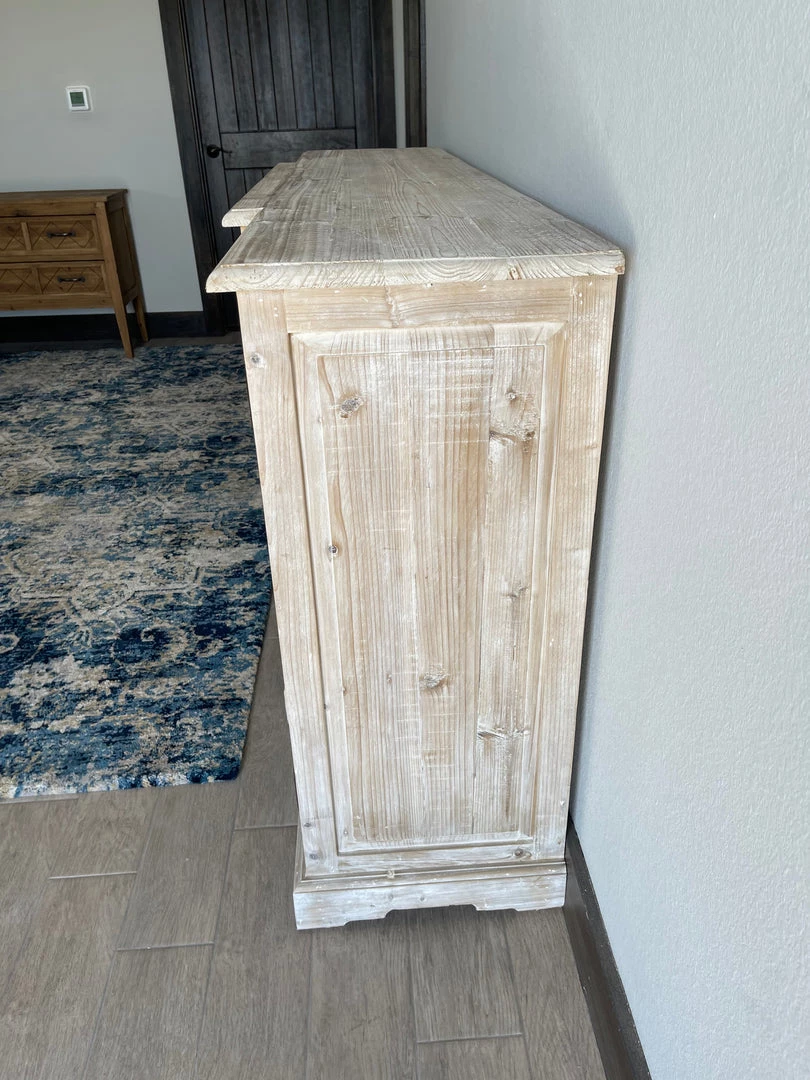 Elm breakfront console in a white wash finish, with stunning fretwork detailing on mirrored doors. Its generous proportions make it a stunning addition to your foyer. Also perfect as your dining buffet. Or–as the most stylish tv console on the planet!