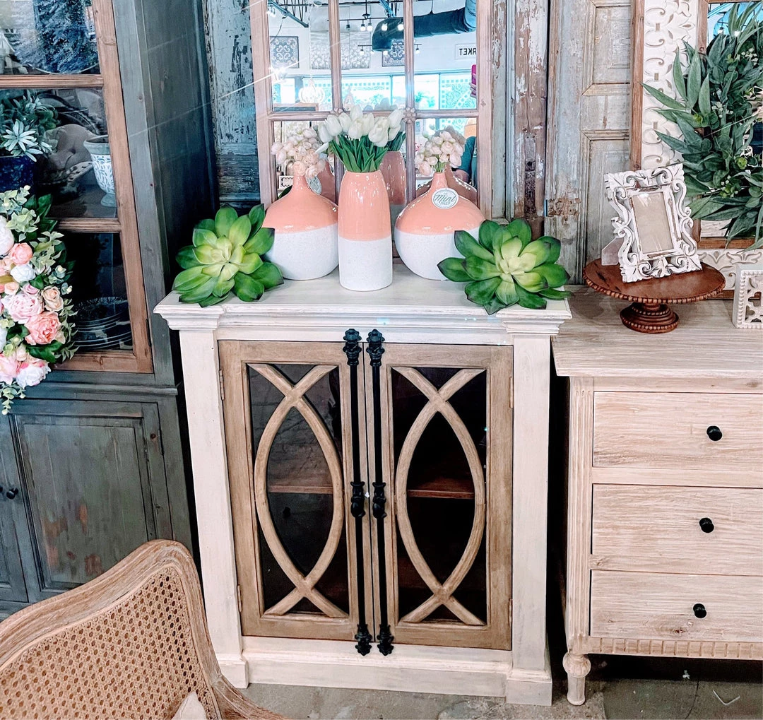 The dynamic duo: style and storage! This versatile accent cabinet boasts classic style with a fresh two-toned fretwork glass door. Imagine it in your entry, bedroom, living or dining room. We could see it full of white towels and bath salts in a large master bath!