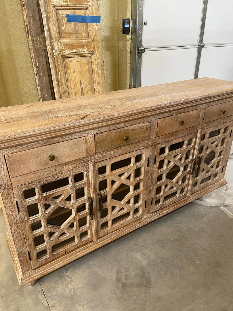Beautiful gray and whitewash console with four fretwork glass doors. Features interior shelf for your decorative displays–or tv peripherals. 4 drawers for storage!