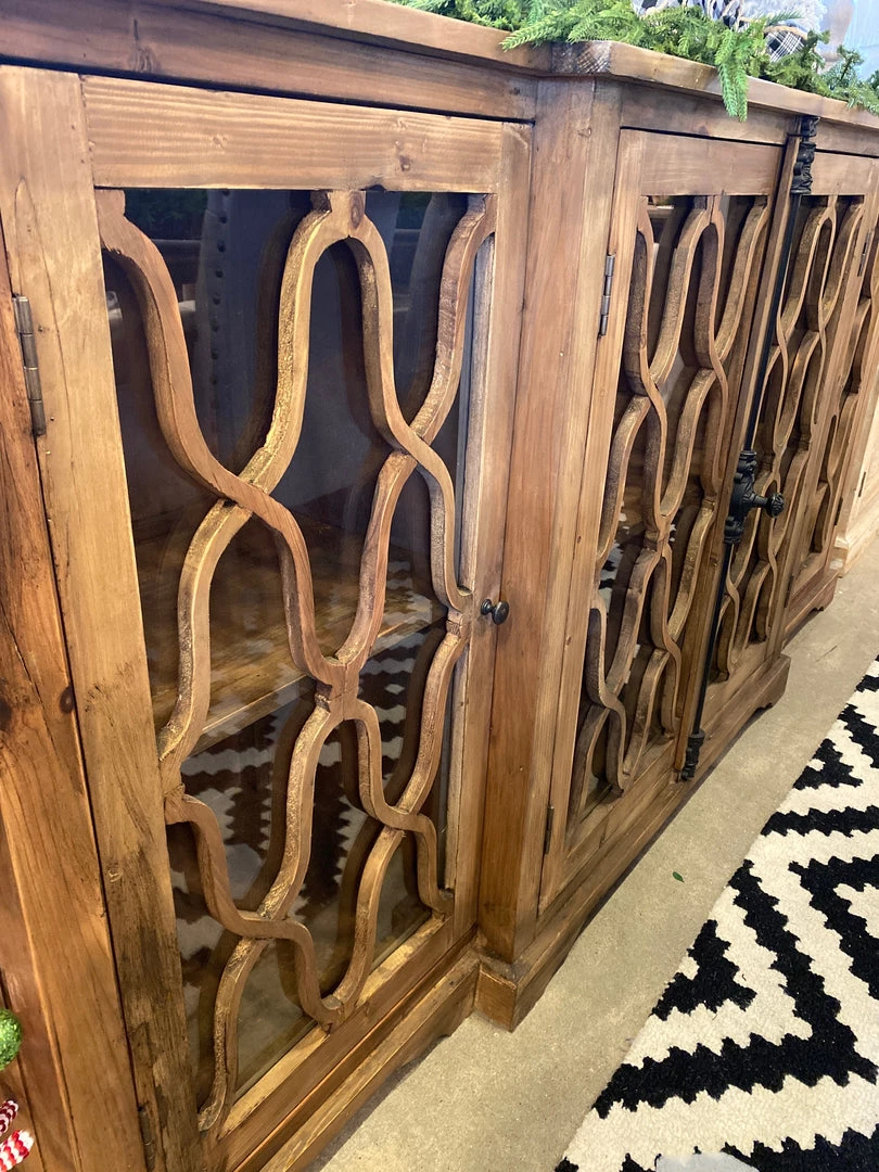 All the right stuff in this standout console: breakfront styling, fabulous fretwork and glass doors, shelving and storage, and unique black cremone bolt hardware. Available in natural or whitewash finish, this console is a stylish and versatile addition to any room.