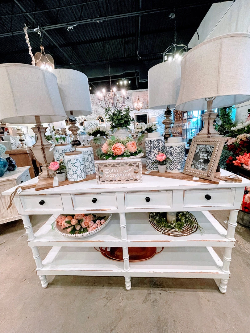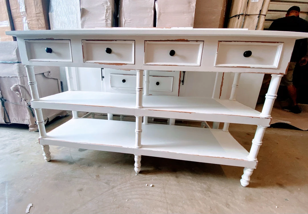 This gorgeous white distressed console (made of solid wood) will surely be the star of your office, media room, or living room. It is the perfect height to mount a TV over and has storage drawers below, as well as two open display shelves.
