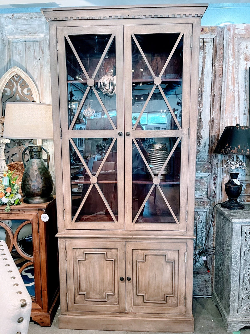 Classic good looks and unique antiqued finish set this display cabinet apart. Distinctive X pattern fretwork on glass doors, and moulding detail on lower doors and top. Display your books or lovely objets d’art in this sophisticated piece.Â