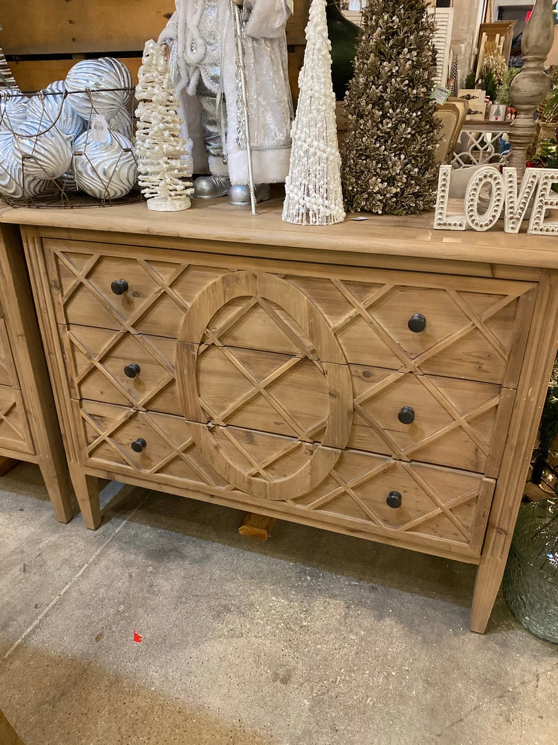 This oversized natural finish nightstand with tapered legs and wonderful carved crisscross detailing offers three long drawers for all your essentials. This makes a perfect accent piece anywhere in your home.