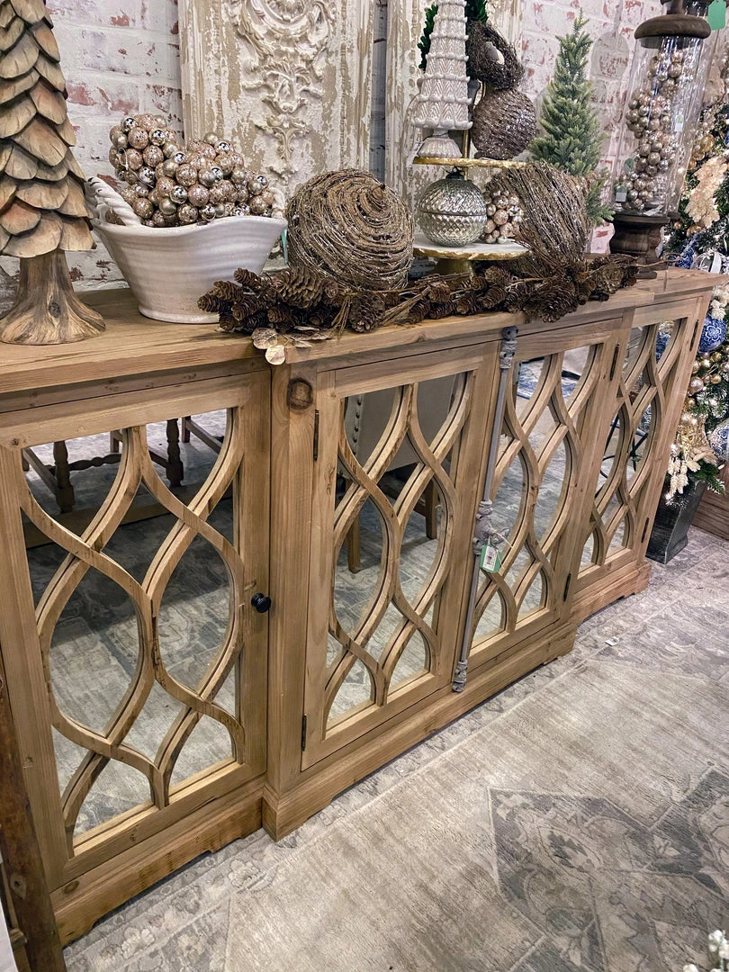 Natural finish elm breakfront with fabulous fretwork and mirror door detail. A stunning piece with generous proportions and loads of storage behind four doors, imagine it in your foyer or dining room. It will also serve as the most upscale TV console on the planet!