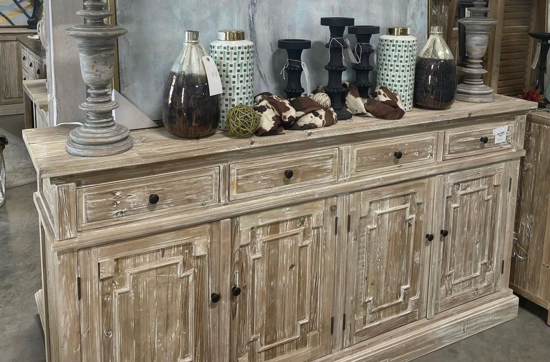 Beautiful and fun piece with classic style with great storage in our solid elm wood sideboard with 4 doors and 4 drawers. Just the right size and the perfect accent piece.