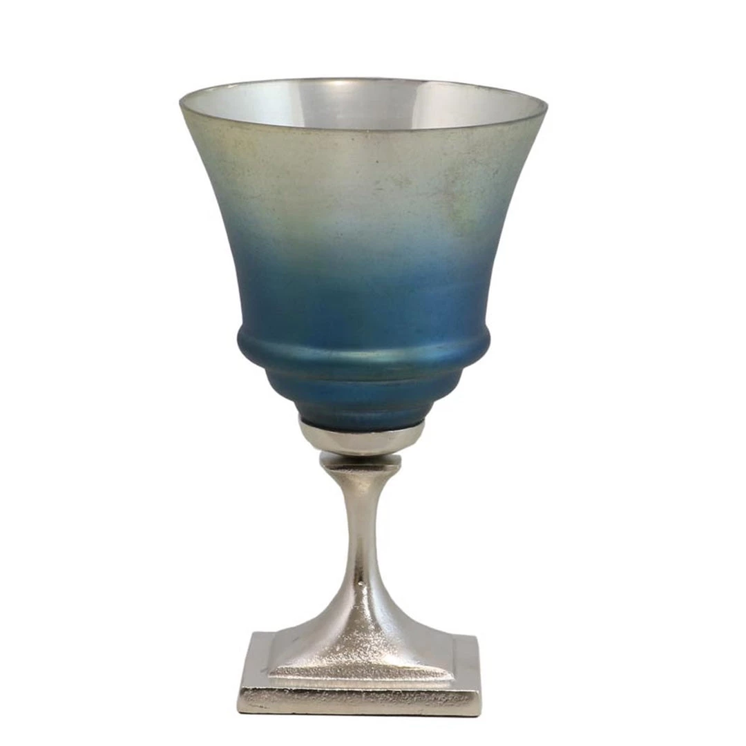 Our striking blue glass and silver tone metal urn is sure to please. Lovely on mantel, shelf, or table, it will bring bold modern style to your interiors. Available in two sizes.