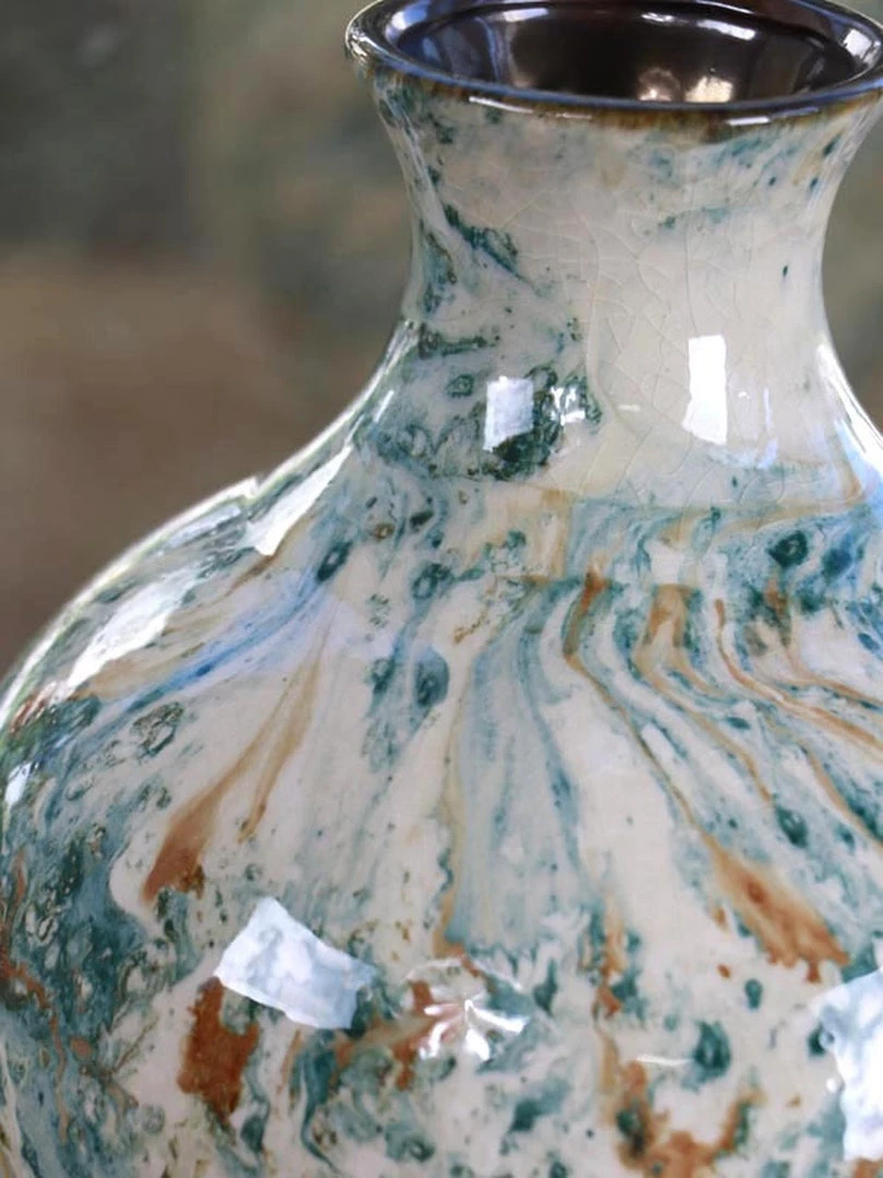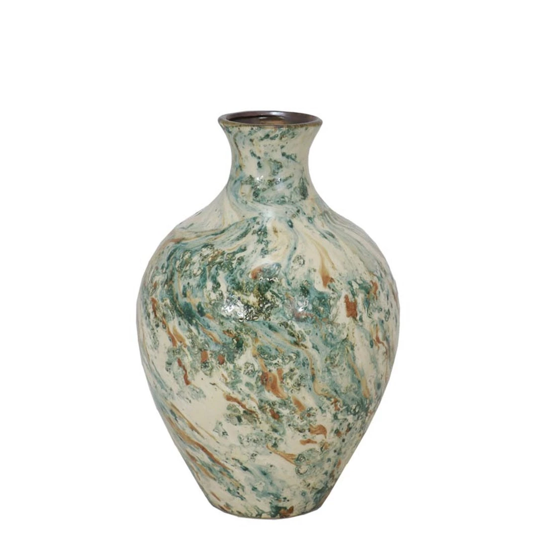 We’re loving the classic shape of our Muse vase! Its swirling glaze pattern in teal, mint and amber will command admiration wherever you place it in your home.Â