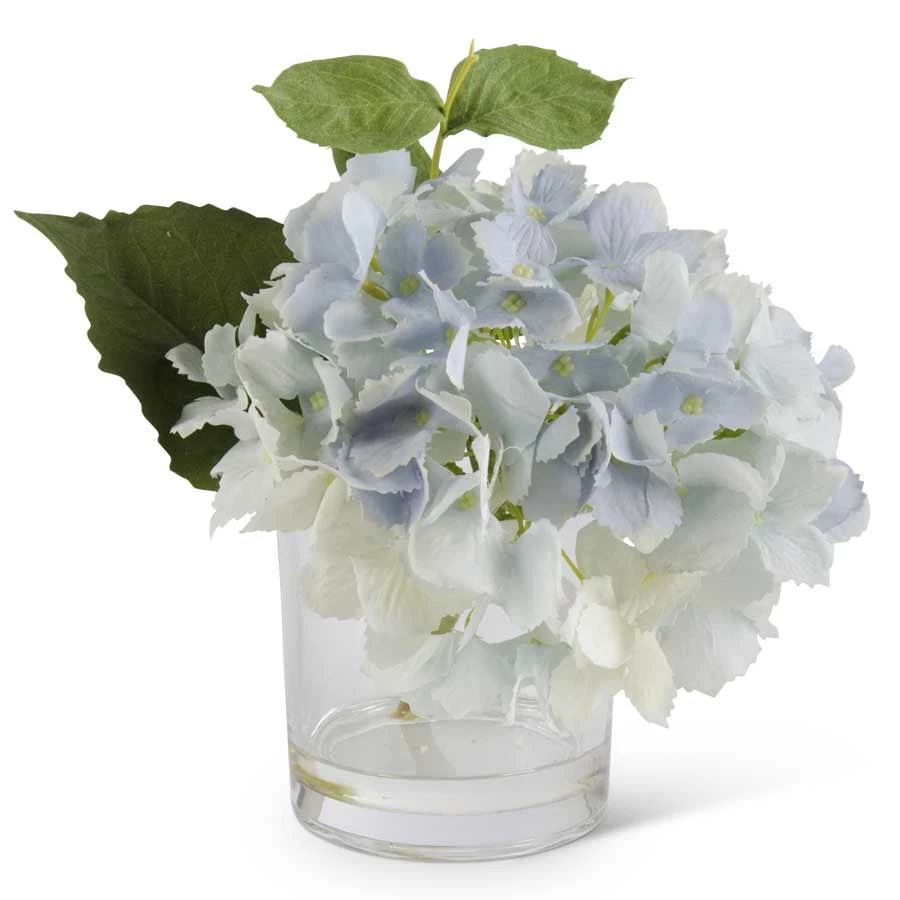 What’s not to love about hydrangeas? You can get that fresh feel of summer all year with this Real Touch blossom in a glass vase. It has all the variations of blue that make hydrangeas a favorite cottage garden favorite. Place it on tray, table, or shelf. Top off a stack of books. A great little accent on your bath vanity or next to your tub!