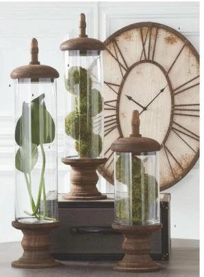 Set of 3 glass cylinder containers with brown wood base and pedestal.