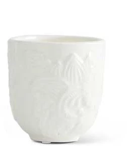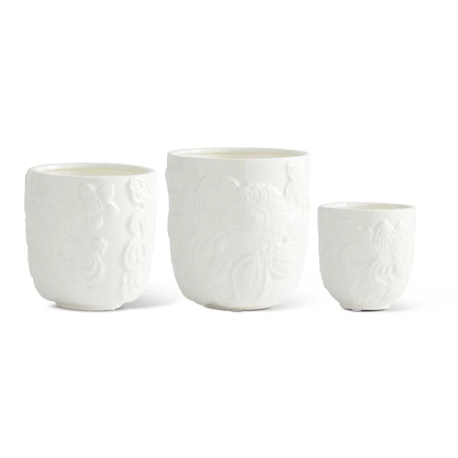You’ll love the artistry of our embossed white ceramic cylinder pots with stylized floral designs. Three sizes to choose from.
