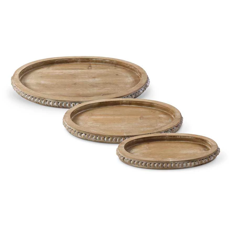 Can you have too many trays? We think not! These wooden beaded oval trays in lightly whitewashed finish will look great on a coffee table, side table, console, or even dining table. Create a grouping on a tray with some of our candleholders, florals, books, or jar candles.. Instant style! 3 sizes.