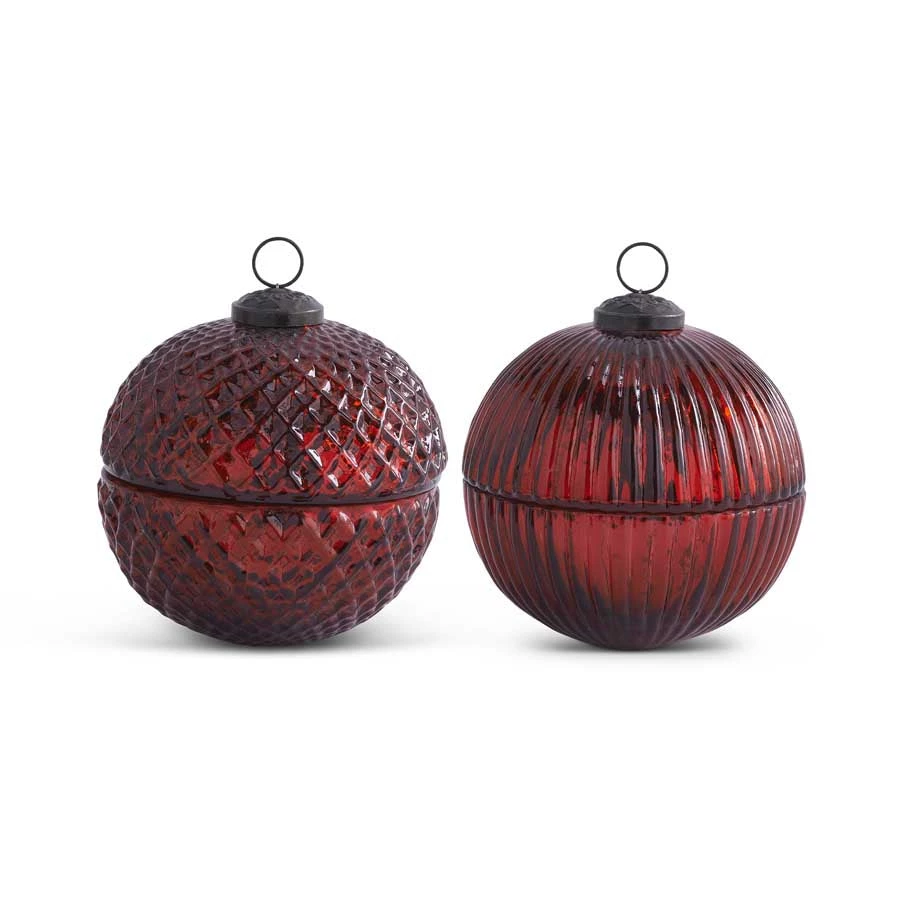 Include our delightful red mercury glass lidded containers styled like ornaments in your holiday table or tray vignettes. Two styles to choose from–stripe or diamond. A sweet gift, too.