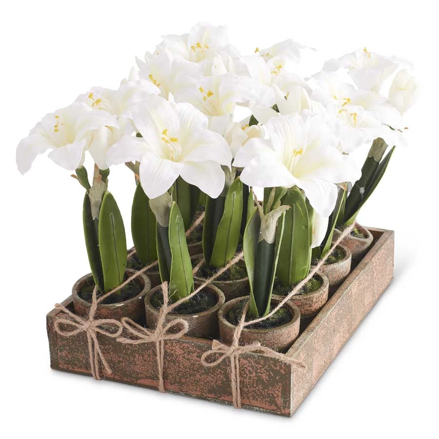 Nothing is so cheery as a showy white amaryllis bloom poking up on a cold winter day. Now you can have the look without the work! Our single faux white amaryllis in earthenware pot is 7.5″H x 10.75″W x 8.25″D.