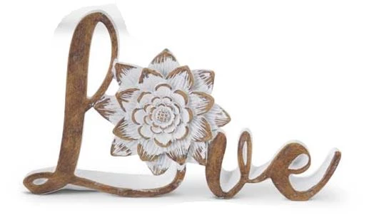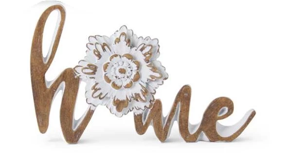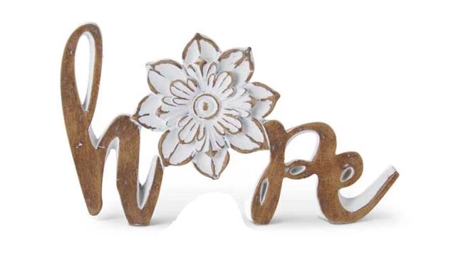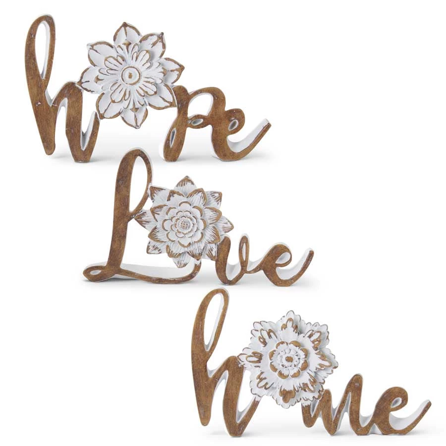 Bring positive messages into your home with our tabletop cutouts in wood look resin with whitewashed flower accents. Three styles: Hope, Home and Love.