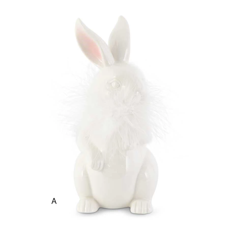 Spring delights: two styles of white porcelain bunny, each with a soft white feather collar for a sweet touch. Choose standing bunny or bunny with planter/egg holder basket. A thoughtful gift, too.