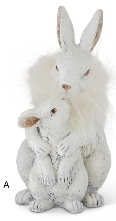 Adorable bunny duos in rustic white finish feature white feather collars for a sweet touch. Two styles. Grad. Sizes 6.25″H x 4″W x 4″D.
