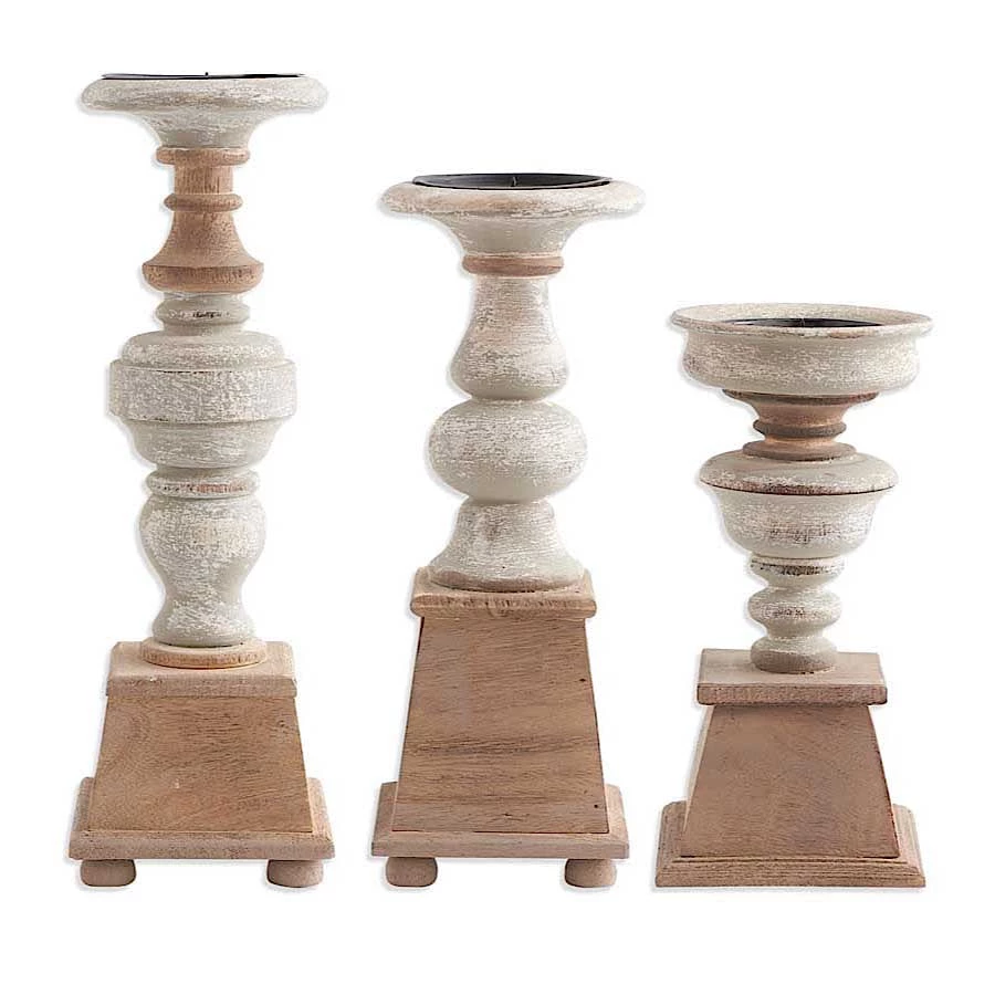 Each candleholder in this stunning farmhouse trio features a turned whitewashed upright mounted on a natural wood square base–each one a slightly different style on the same rustic theme. Just wonderful grouped together on your mantel, entry console or coffee table–in any season! Be sure to check out our collection of flameless flickering candles!