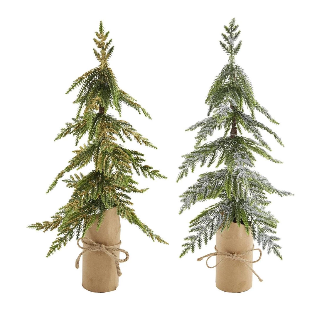 Glitter washed faux tree with kraft paper wrapped trunk.
