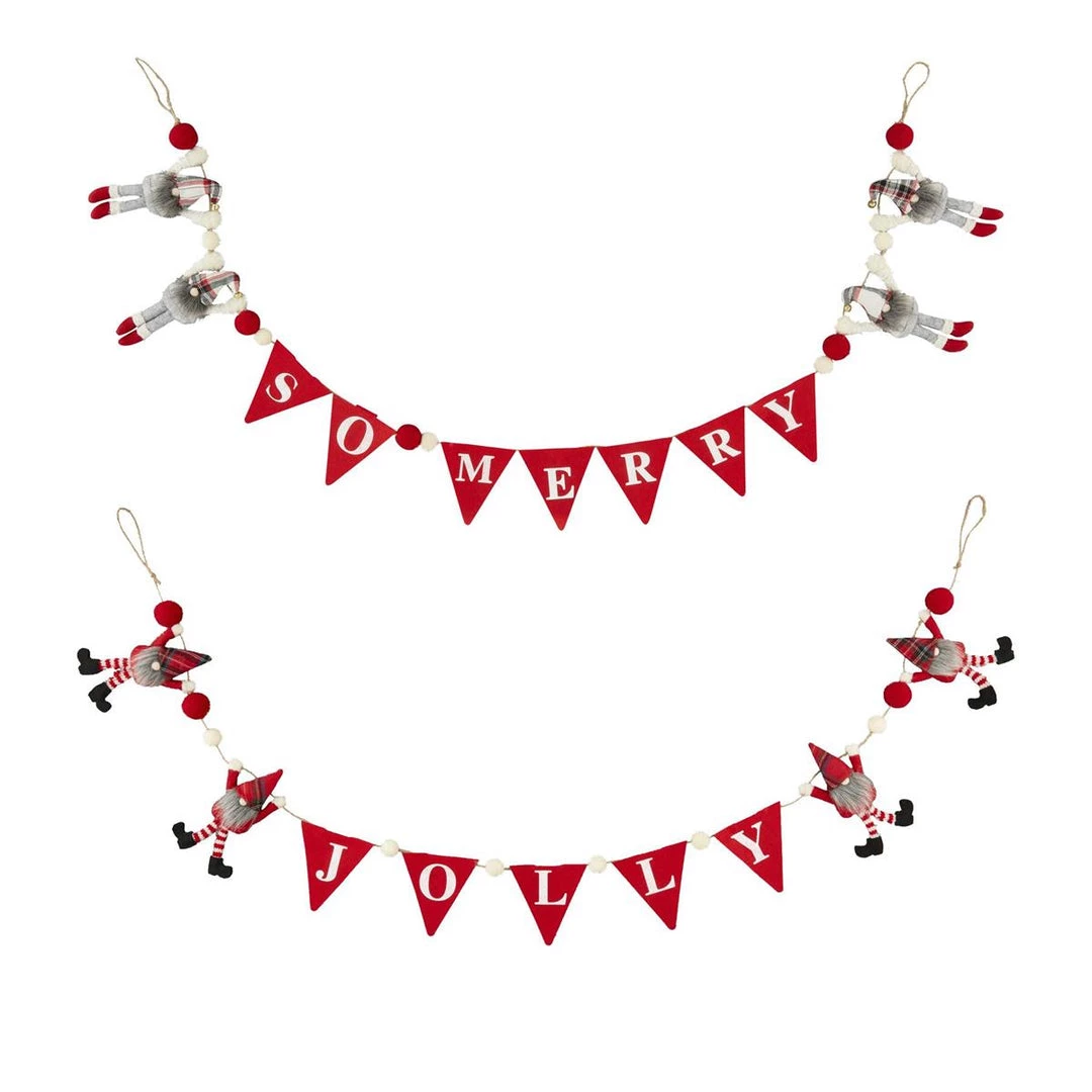 Felt pennant banner on jute rope features poms and dangling felt and knit gnomes.
