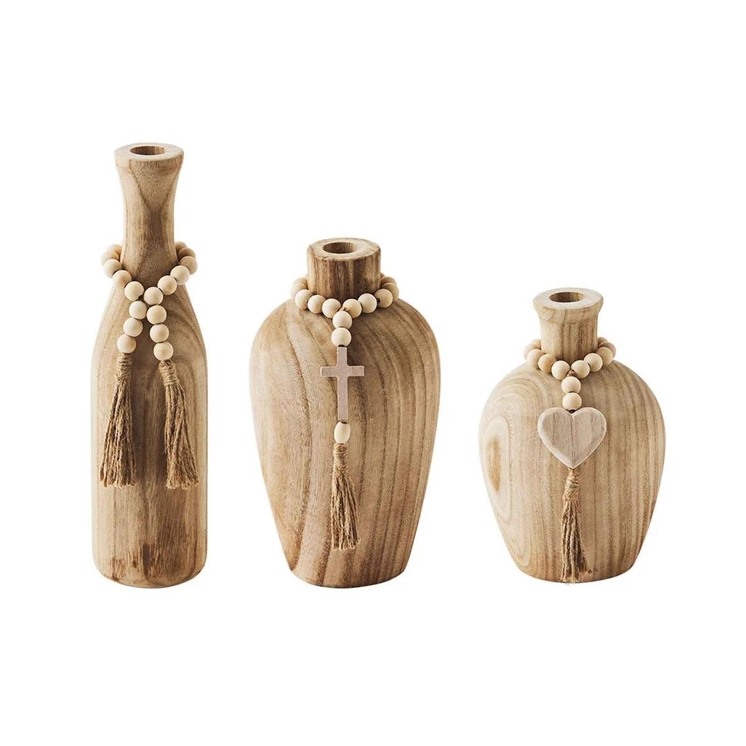 Paulownia wood vase in three styles features accent beads with charm and jute tassel.