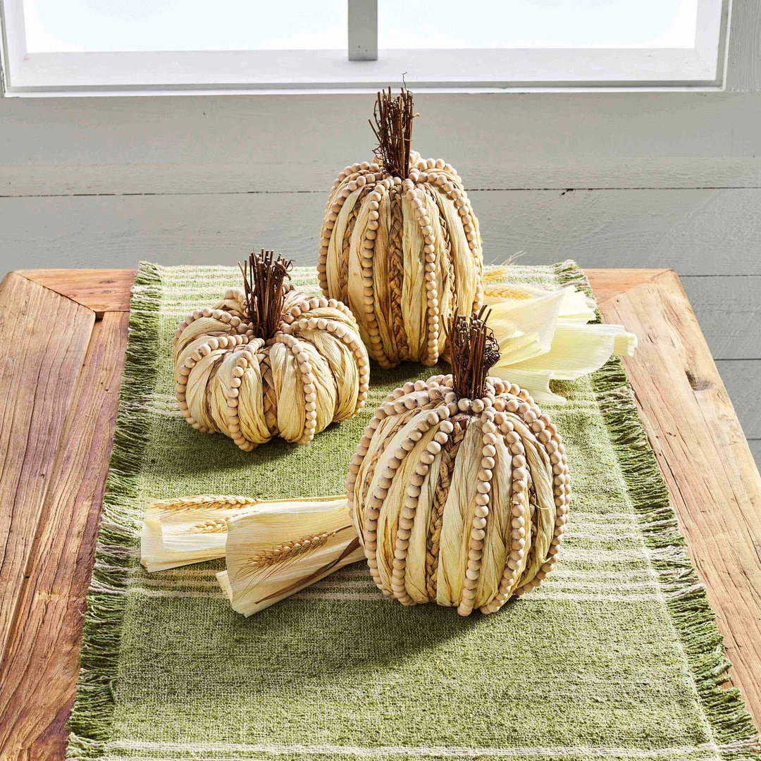 These Beaded Husk Pumpkins are the decor pieces you need for this season. The water hyacinth pumpkins feature corn husks and wood bead details with a wood branch stem. The beaded details and the branch stem make these decoration pieces so unique.