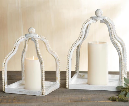 Can you picture these lovely lanterns on your hearth, buffet, coffee table or entry console? Fabulous whitewashed mango wood open-air lanterns feature beaded detail and top knob finials. Consider a flameless candle and boxwood wreath inside! Adaptable to many decor styles. Purchase individually or as a set.Â