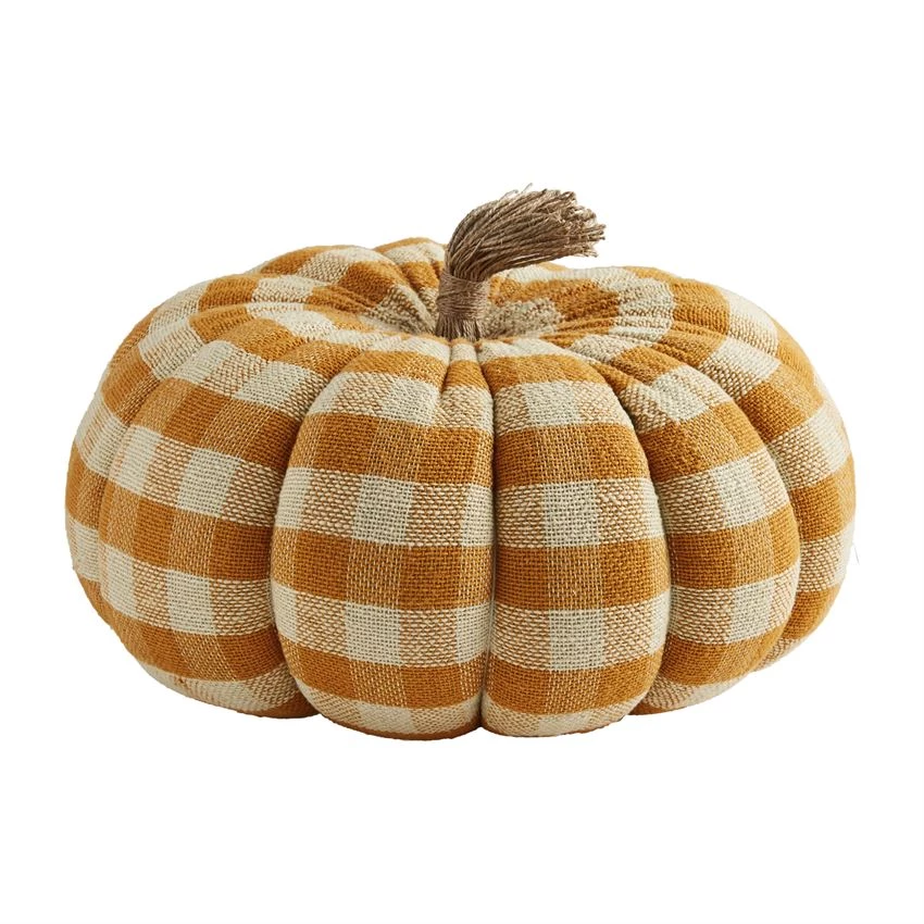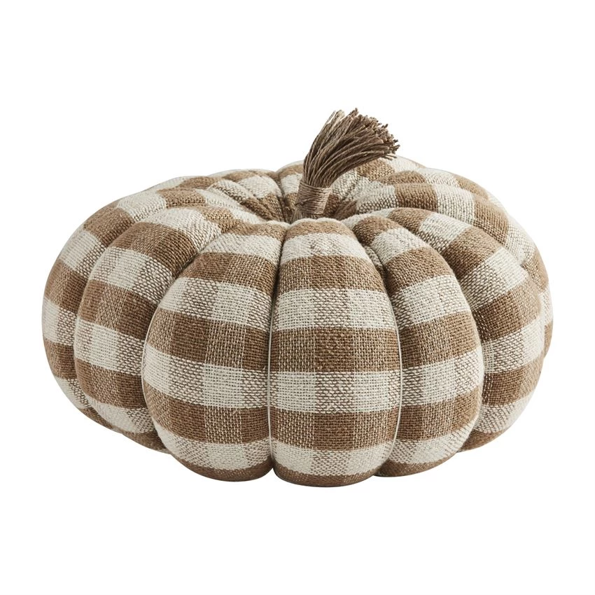 Hello, farmhouse fall! You’ll want all three sizes of our buffalo check stuffed pumpkins in gold, grey and brown. Features jute rope stem. Just the thing for your autumn decor!