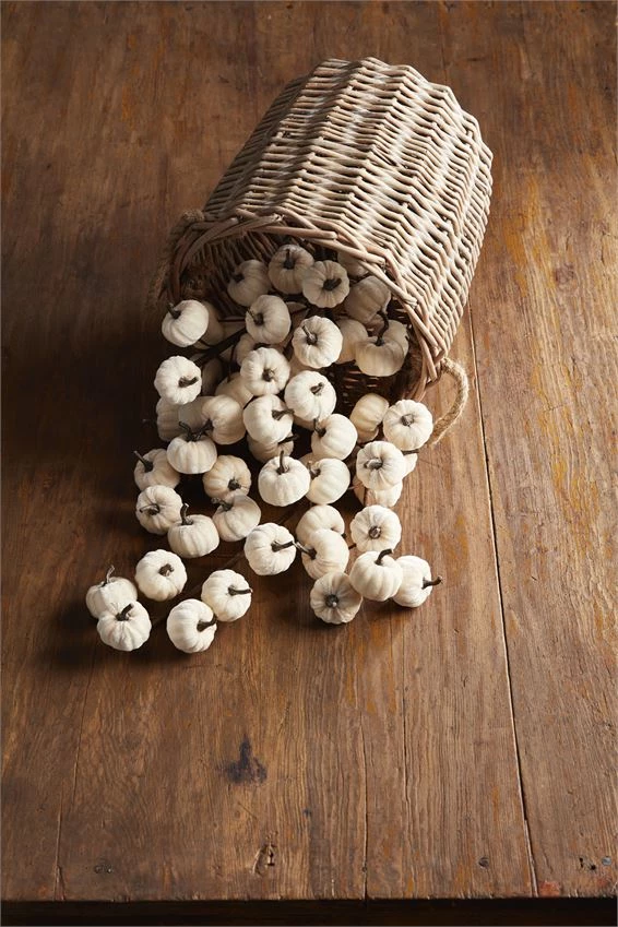Velvet mini pumpkins on faux bois adjustable stem.