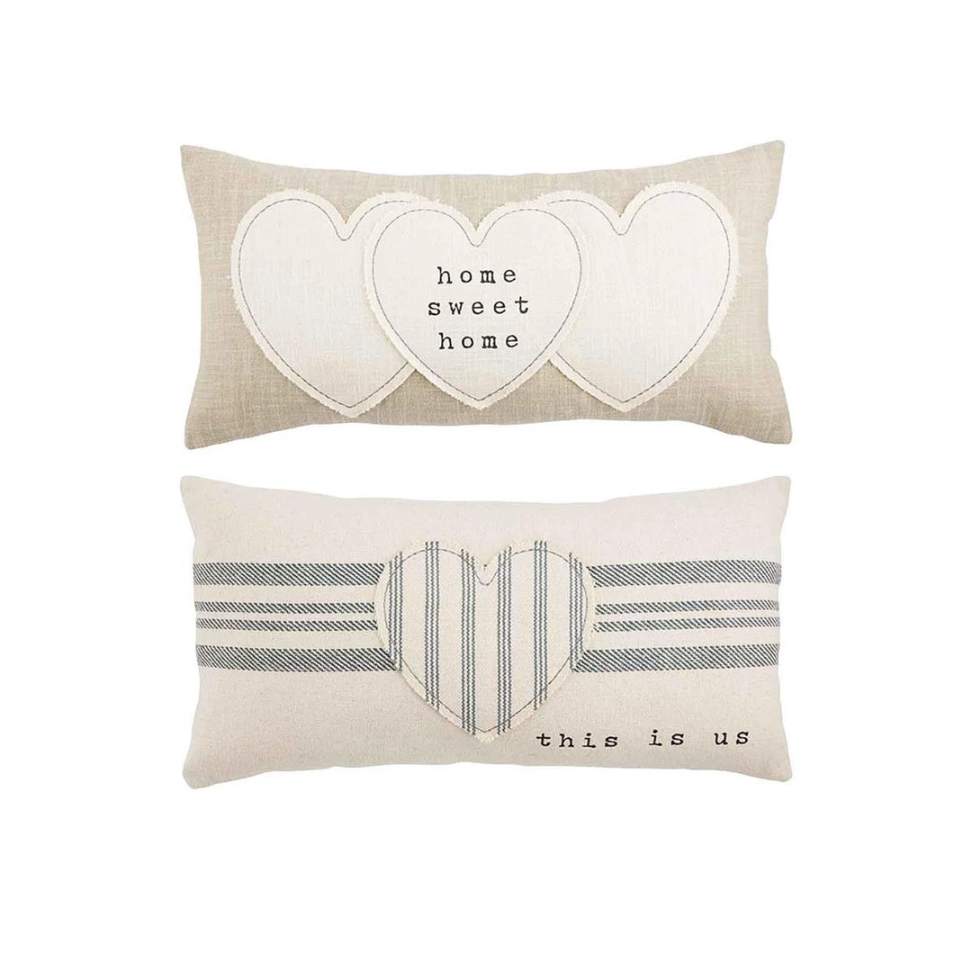 Celebrate the good vibes at home with our cotton heart applique rustic pillows in two styles: tan and cream “Home Sweet Home” and ticking stripe “This is us”. Zipper closure.