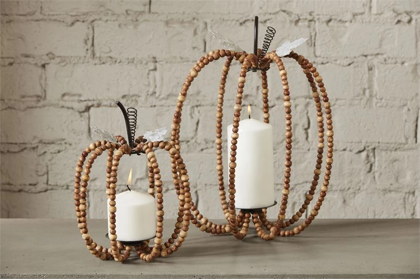 Set of two mango wood bead wire pumpkin lanterns. Metal stem and tin leaf.