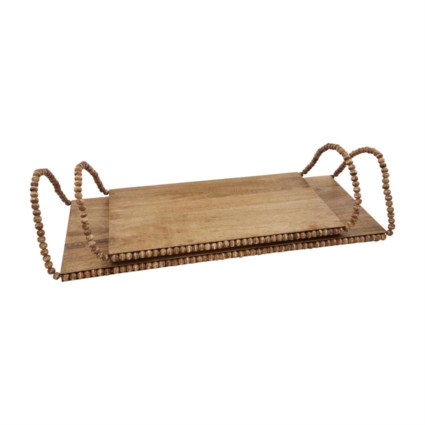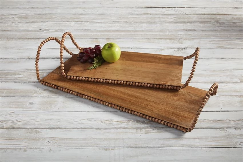 Serve your guests in style with our sophisticated whitewashed mango wood footed serving boards featuring beaded rims and handles. Two sizes.