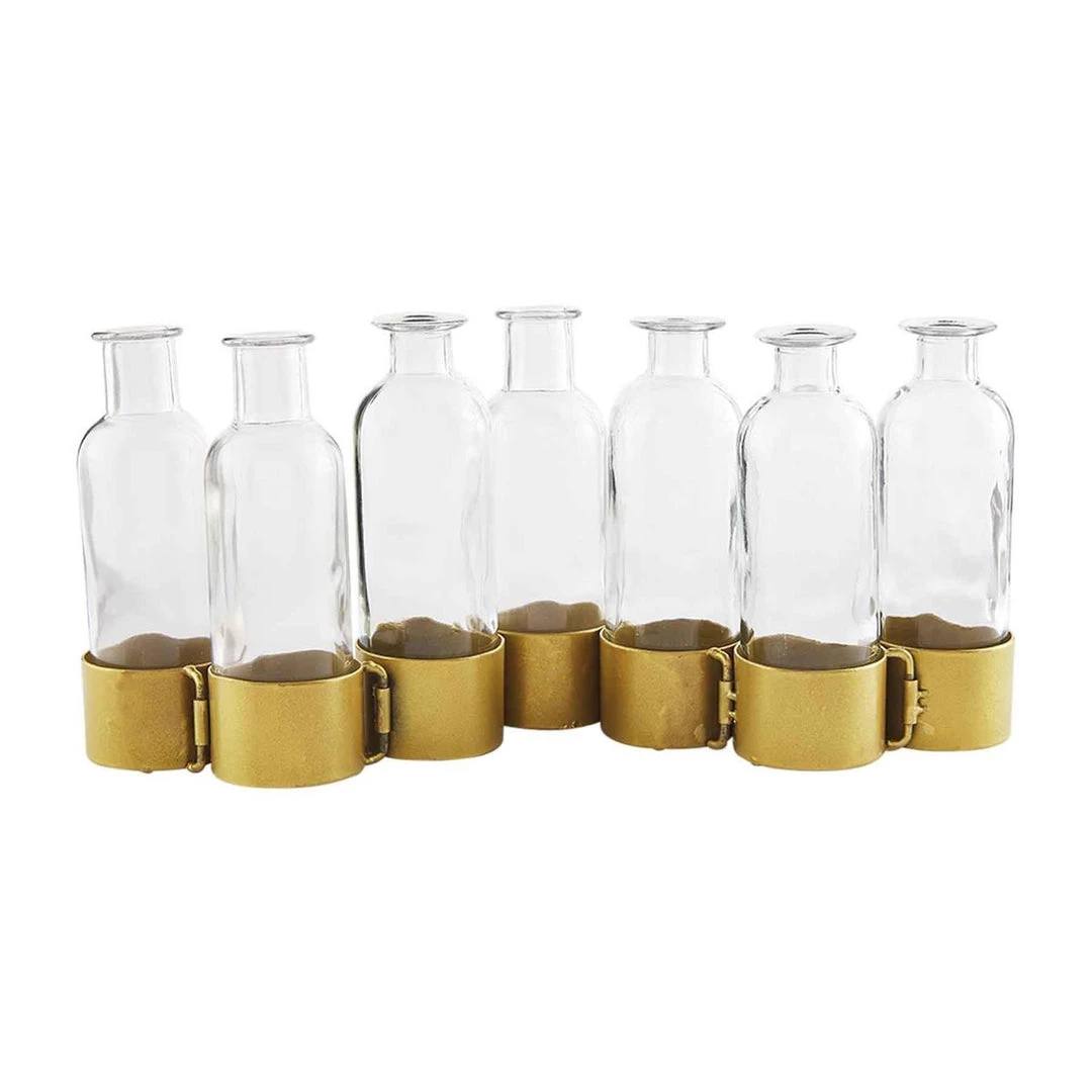 8-piece set. Seven glass bud vases rest in brass-finish adjustable metal link base. Waiting for your floral buds!