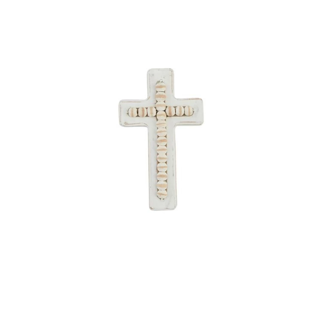 A lovely decorative piece and a perfect gift, our mango wood cross features a white-washed finish and a raised beaded center.