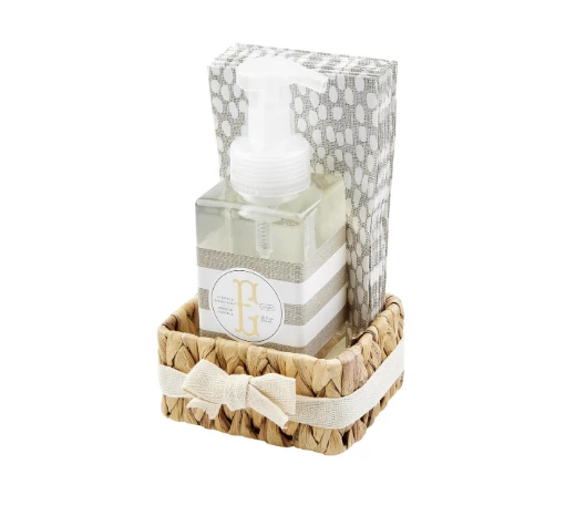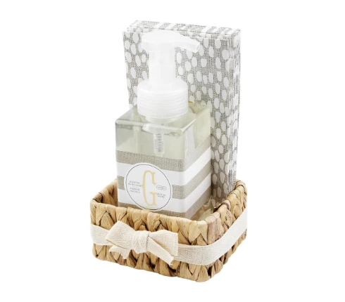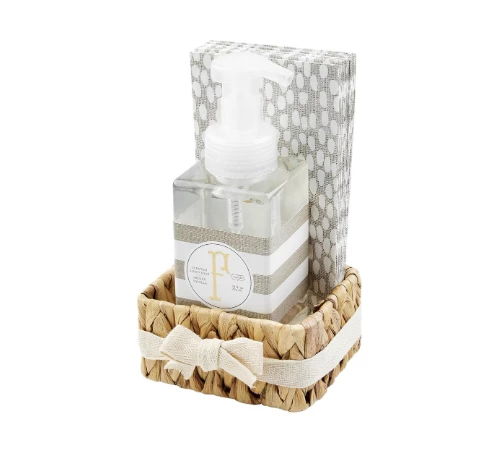 3-piece set. Vanilla scented liquid hand soap comes in hyacinth basket with pack of 12 foil initial paper hand towels.