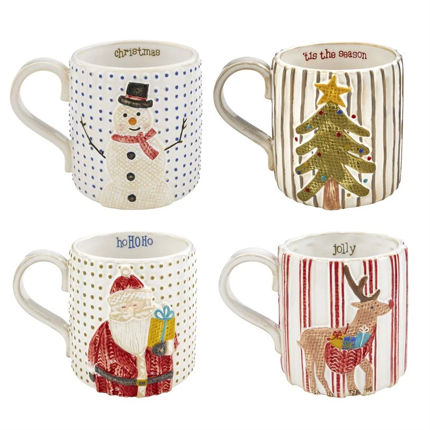 Delight you holiday visitors with our hand-painted stoneware mugs featuring cute and graphic seasonal designs. Choose from snowman, Santa, Christmas tree, or reindeer. Better yet–get the set of four so every family member can have their own style! A great gift, too!