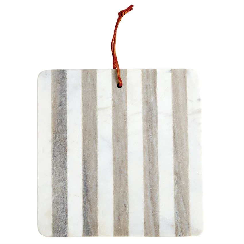 Our grey and white striped marble serving board is a style standout! Features faux leather loop. Handy–and beautiful too!