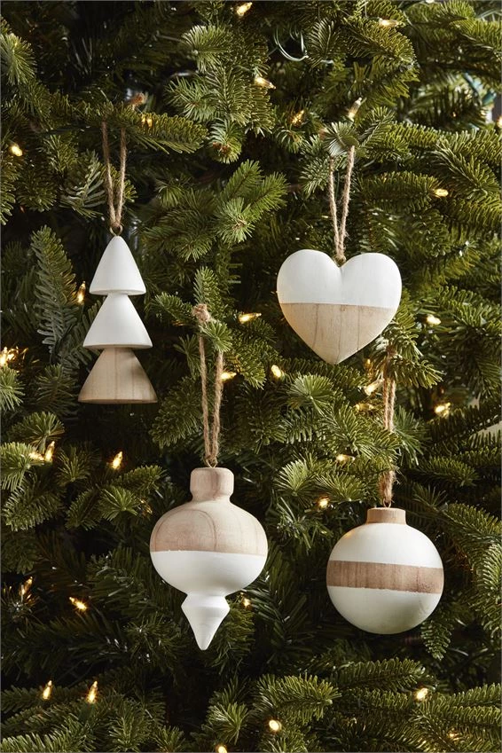 Simple and beautiful, our white and wood hand-painted paulownia wood ornament is the perfect complement to your neutral, woodland, farmhouse, modern or French country holiday decor. Choose ball, heart, finial, or tree.