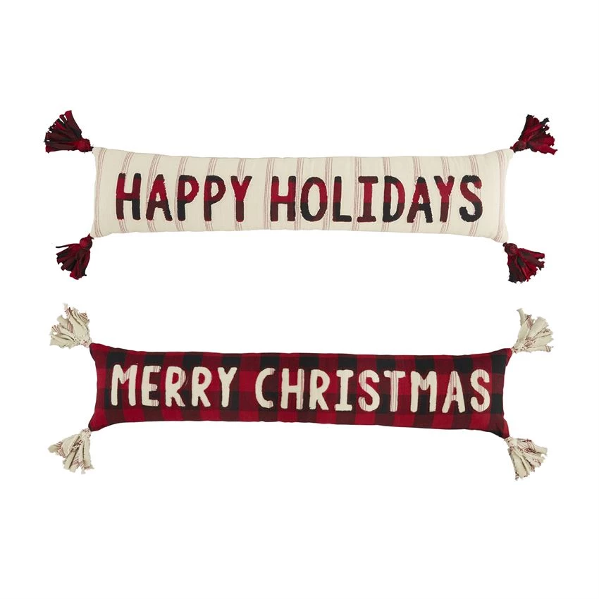 Spread holiday cheer with our Christmas pillow! Long skinny appliqued cotton pillow with corner tassels is perfect for the sofa, bench or bed. Choose from stripe pillow with red and black buffalo check applique sentiment, or buffalo check pillow with white applique. Sassy!