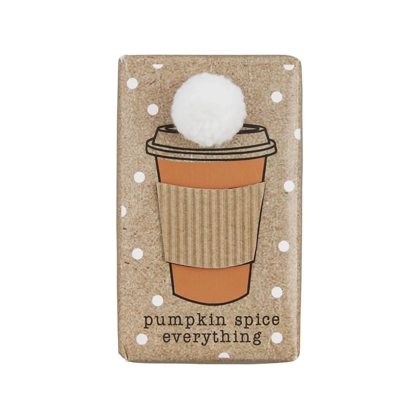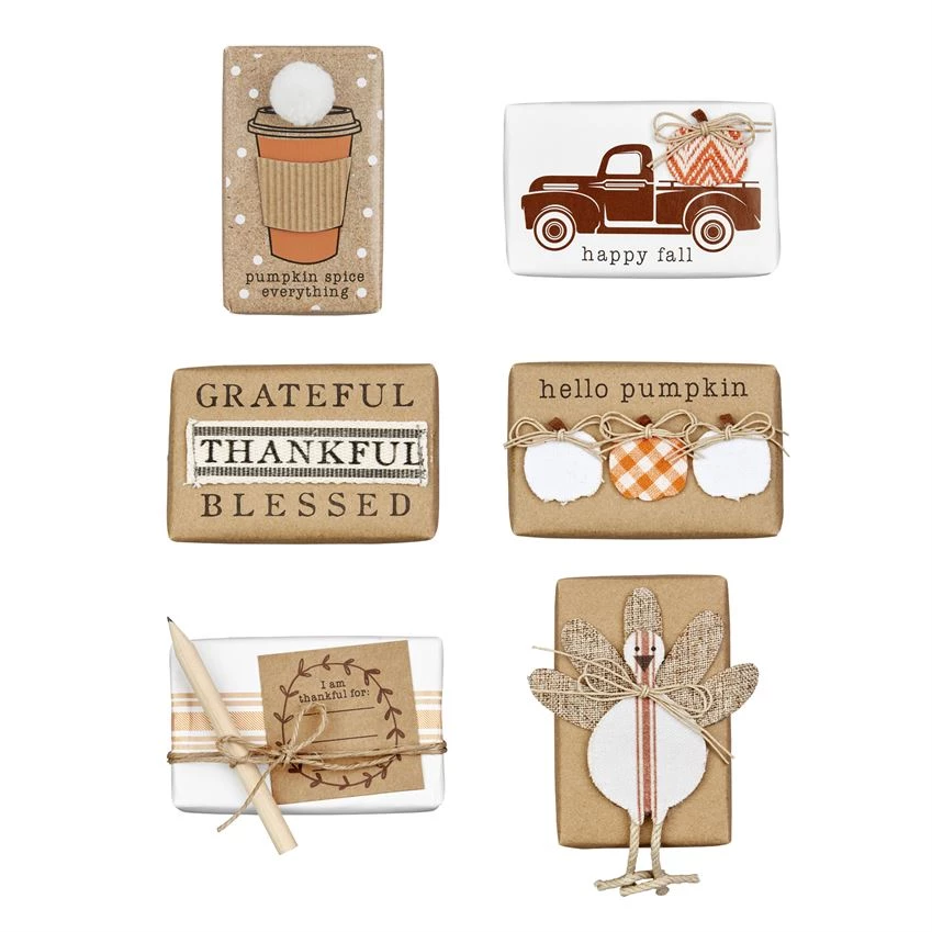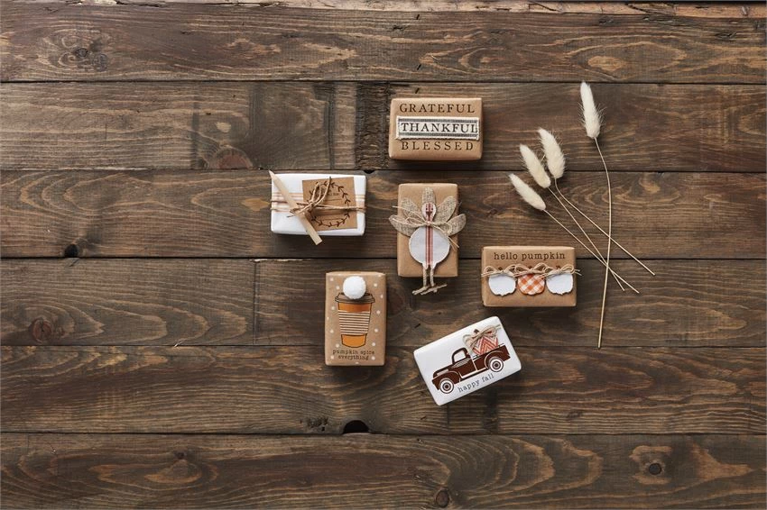 Our harvest spice-scented hand soap comes in kraft paper wrap with fall holiday embellishment. Choose from six styles–all adorable. You’ll want some for your guest bath and some for gifts!Â