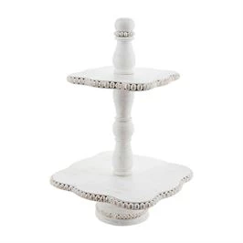 Two-tier mango wood server features turned center rod and beaded detail. Knocks down for storage.